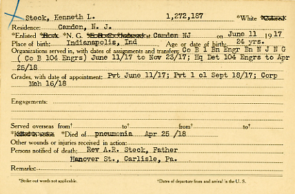 PRIVATE KENNETH L. STECK of 214 North 5th Street, Camden, New Jersey was the son of Reverend and Mrs. A. R. Steck. He enlisted in the Camden Engineers and became a member of Company B, 104th Engineers at Camp McClellan, Anniston AL when his unit was sent there for training. Kenneth Steck died of pneumonia at Camp McClellan, Anniston in April of 1918. He was 24 years old at the time of his death. Kenneth Steck was survived by his father, Rev. A. R. Steck, of Carlisle PA. |