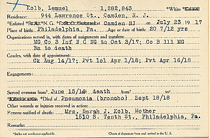PRIVATE LEMUEL KOLB was born in Philadelphia, Pennsylvania in December of 1896 to John and Sophia Kolb. He lived in Philadelphia most of his life, but had come to Camden by the spring of 1917, when he was living at 944 Lawrence Street. He enlisted at Camden on July 23, 1917 in the Third Regiment, New Jersey National Guard. In October of 1917 he was transferred to Company B, 11th Machine Gun Battalion. Private Kolb went overseas in June of 1918. Private Kolb fell victim to the Spanish flu pandemic that took millions of lives in the fall of 1918. He died of bronchial pneumonia on September 18, 1918 in France. Private Kolb was brought home in the spring of 1921. He was buried on May 28 at Arlington Cemetery in Drexel Hill, Pennsylvania. |