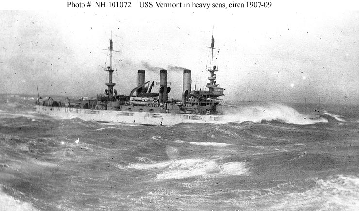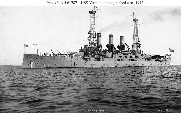 . USS Vermont , a 16,000-ton Connecticut class battleship, was built at Quincy, Massachusetts. Commissioned in March 1907, she spent most of the rest of that year on trials, "shake down" operations and fleet maneuvers. With other Atlantic Fleet battleships, she left Hampton Roads, Virginia, in December 1907 to begin the era's most important demonstration of Naval mobility, the World cruise of the "Great White Fleet". Over the next fifteen months, Vermont steamed around South America to the U.S. west coast, crossed the Pacific and Indian Oceans, transited the Suez Canal and returned to Hampton Roads via the Mediterranean Sea and Atlantic Ocean. Modernized after this trip, Vermont received two "cage" masts and other new features. After completion of this work in June 1909, she spent most of the following eight years taking part in fleet operations along the U.S. east coast and in the Caribbean. In 1910-11 and again in 1913, the battleship crossed the Atlantic to visit European ports. She also participated in the Vera Cruz intervention during April-October 1914, and supported U.S. Marines in Haiti in 1916-17. In December of 1914, Leon Dickinson's enlistment in the Navy expired. He subsequently enlisted in the United States Army around March of 1916, and served with General John J. Pershing's expedition into Mexico in pursuit of Pancho Villa. When America entered World War I, Sergeant Dickinson went overseas, as a member of Company G, 28th Infantry Regiment. Sergeant Leon Dickinson was first reported missing during the battle of Chateau-Thierry on July 20, 1918. The War Department changed his status to killed in action in May of 1919. Although he is not memorialized as Missing in Action in any of the overseas cemeteries operated by the American Battlefield Monuments Commission, it is not known at this time if his remains were ever recovered. |