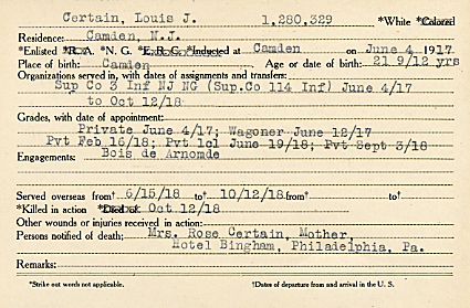 PRIVATE LOUIS J. CERTAIN JR. was born in New Jersey in 1896 to Louis J. and Rose Certain. The family was living at 106 West Street in March of 1906 when their home suffered fire damage as a result of the fire that destroyed the old Sixth Regiment Armory at West and Mickle Streets. At the time of the 1910 Census, the family lived at 10 Park Place in Camden. The elder Certain worked as a house carpenter, while his wife listed an occupation of "washer woman" to a private family. Also at home were older brother Grover C. 16, and sister Louise, both already working by the time the census was enumerated. Louis J. Certain Jr. was living at 337 Spruce Street in Camden NJ prior to enlisting in the old 3rd Regiment, National Guard of New Jersey in June of 1917. He was sent to Camp Edge at Sea Girt NJ on July 25, after which he and the rest of his unit were sent to Camp McClellan, Anniston AL where they became the 114th Infantry Regiment. Private Louis J. Certain