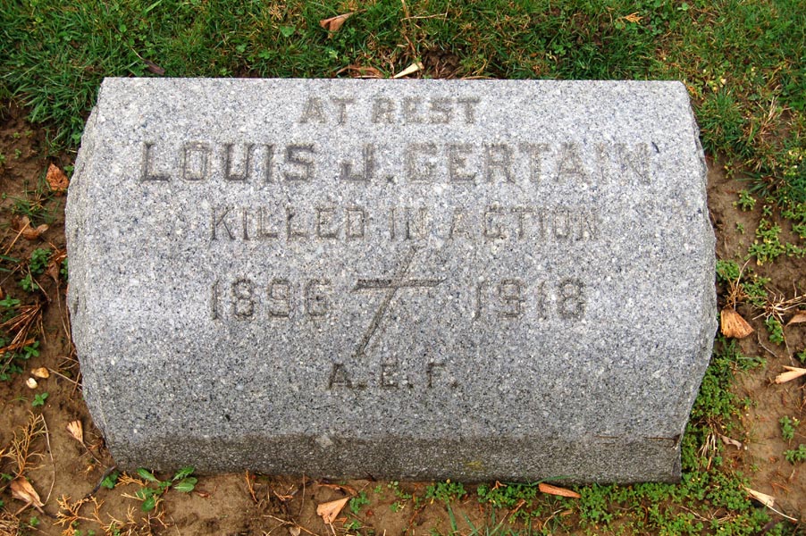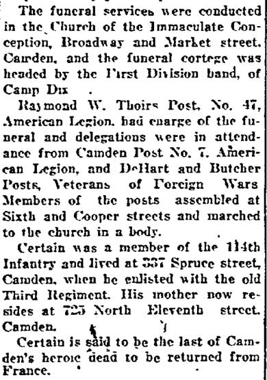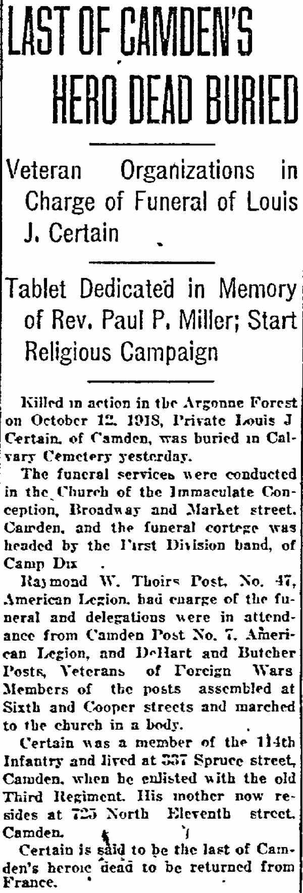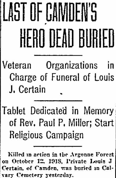 Infantry, the 114th moved to attack at the hour designated. On October 12, 1918 the Bois d'Ormont was conquered at the cost of 118 casualties. Private Certain and several other Camden County men were of that number. Private Louis Certain was survived by his mother, Mrs. Rose Certain of 725 North 11th Street, Philadelphia PA, a brother, Grover C., and sisters Ida and Louise. Grover Certain was living in Philadelphia in April of 1930. He later moved to California. Louis Certain was brought home in 1921 and after services in Camden at the Church of the Immaculate Conception was buried at Calvary Cemetery in Delaware Township (present-day Cherry Hill), New Jersey with full military honors. |