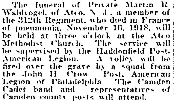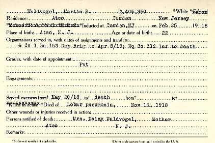 pneumonia. He died on November 16, 1918 in France. Private Waldvogel was