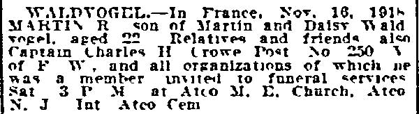 MARTIN ROSER WALDVOGEL was the son of Martin and Daisy Waldvogel, of Atco,