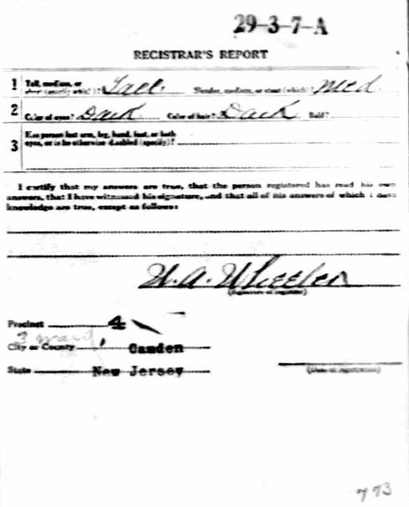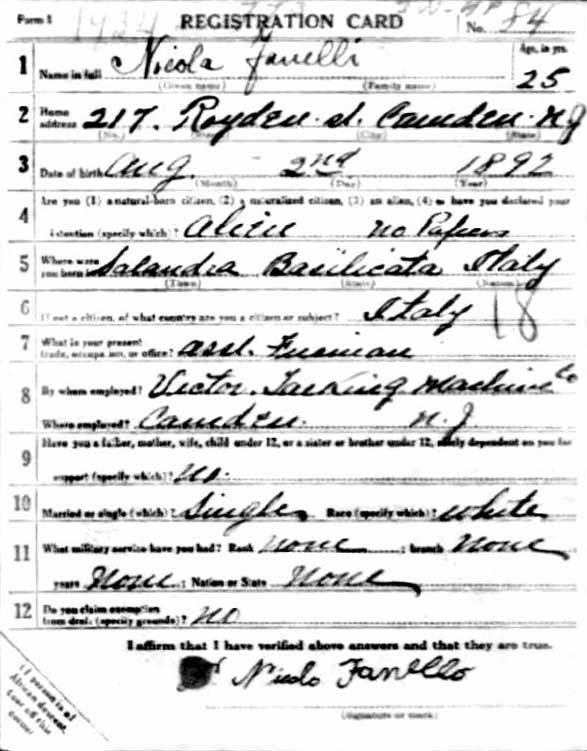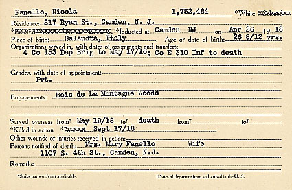 PRIVATE NICOLO FANELLO was born in Salandra Basilicata, in southern Italy on August 2, 1892. When he registered for the draft on June 5, 1917 Nicola Fanello was living at 217 Royden Street in South Camden. He was then employed by the Victor talking Machine Company. He married shortly afterwards, and lived with his wife Mary at 1107 South 4th Street in Camden. Nicola Fanell was was drafted on April 26, 1918, and sent to Camp Dix, where he became a member of Company E, 310th Infantry Regiment. He went overseas with his unit in the spring of 1918, arriving in France in May. Private Fanello was killed during a gas attack in the Argonne Forest on September 27, 1918. He was survuved by his wife, Mrs. Mary Fanello, of the South 4th Street address. |