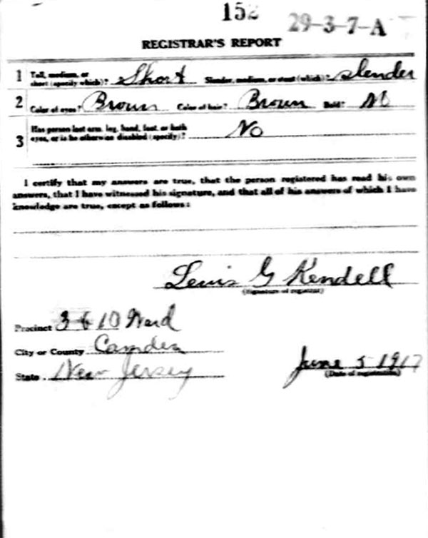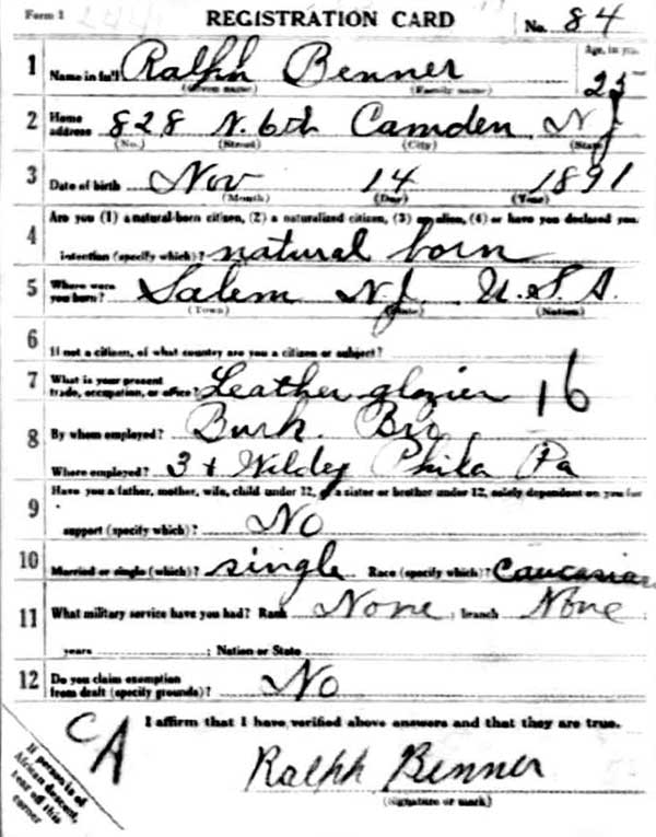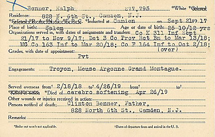 PRIVATE RALPH BENNER was born in Salem NJ on November 14, 1891 to Clinton C. and Carrie Benner. He was one of at least seven children. Clinton Benner conducted a grocery store in Salem, where the family lived, at 266 Broadway, in 1900. By 1906 the Benners had moved to Camden. City Directories show that the family lived at 557 York Street in North Camden through 1912. Clinton Benner was then in wholesale produce, and Ralph, the oldest son, was working as a clerk in a drugstore. By 1914 the family had moved once again, to 828 North Sixth Street in North Camden. When Ralph Benner registered for the draft in June of 1917, he was working as a leather glazier at Burk Brothers, 3rd and Wildey Streets in Philadelphia PA. Prior to being called up in September, 1917, he had been a member of the Ottawa tribe of the the Improved Order of Red Men, a patriotic fraternal organization. After initially being sent to Camp Dix, he sailed for France in February of 1918. Private Ralph Benner died of cerebral softening at Base Hospital No. 214, Seveney, France, fifteen miles from St. Nazaire, on April 26, 1919. As a member of the medical detachment of the 314th Infantry Regiment, Private Benner had seen action five battles during the war. Private Ralph Benner was survived by his father, Clinton C. Benner, also of 828 North Sixth Street, Camden NJ. Also surviving and residing at the North 6th Street address were brothers Norman and Hubert C. Benner, and sisters Verna and Emma H. Benner. Ralph Benner was a member of the patriotic fraternal organization, the Improved Order of Red Men, belonging to Ottawa Tribe No. 15, which met in Morgan's Hall on Market Street in the years leading up to America's entry into World War I. Ottawa Tribe No. 15 members included J. Richard Geist, Fillmore Haines, Burton Bagg, john harkins, Joseph Covert, and William Schucker. |