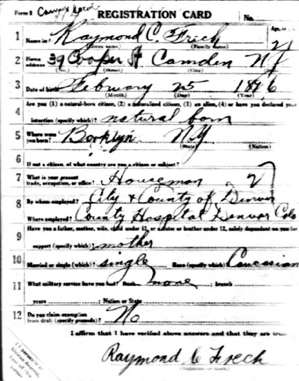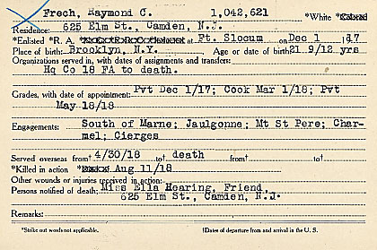RAYMOND C. FRECH was born February 25, 1896 in Brooklyn NY. When he registered for the draft, he gave his home address as 39 Cooper Street in Camden NJ. He listed his employer as the City and County of Denver, Colorado, for whom he worked as a houseman at the County Hospital in Denver. He was single at the time, with his mother as his dependent. According to the book Camden County in The Great War , Raymond Frech had served two hitches in the United States Navy, initially enlisting at the age of 14. He participated in the naval action at Veracruz, Mexico in November of 1914, and was wounded twice during the battle. His enlistment in the Navy expired in October of 1917, after which time he enlisted in the Army and was sent to Fort Slocum NY. After training at Fort Slocum, he was sent to Fort Bliss TX, and was wounded again during a battle with Mexicans, who had made a raid across the border. Subsequently he was assigned to the Headquarters Company of the 18th Field Artillery Regiment, 3rd Infantry Division, and went to France in April of 1918. Private Frech went overseas as a cook with the Headquarters Company. He was killed in action on August 11, 1918. At the time of his death, Raymond Frech was an orphan. He listed a friend, Ellen E. Hearing, of 625 Elm Street in Camden NJ, as his next of kin. He was brought home after the war and buried at Philadelphia National Cemetery. |