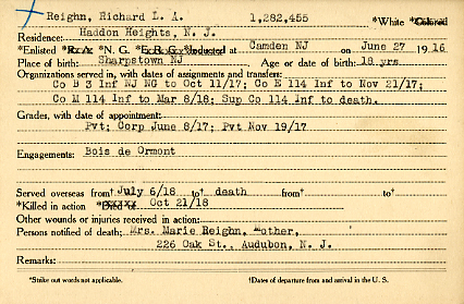 PRIVATE RICHARD L. REIGHN was the son of William and Marie Reighn, of 428 Evans Street in Camden NJ. He was born around 1900, probably in Pennsgrove, Salem County NJ, where his father was a farmer. By 1910 William Reighn was running a farm in Lumberton Township, Burlington County NJ. William Reighn's sister Abigail married William Munion, their daughter Amanda married Arthur Kessler and had moved to North Camden by 1900. Richard Reighn was living at 15 East Atlantic Avenue in Haddon Heights NJ when he enlisted in the 3rd Infantry Regiment, New Jersey National Guard, in 1916, possibly with his older brother Charles, who is known to have been living in the adjacent town of Audubon in June of the following year. Private Richard Reighn left Camden for Camp Edge, Sea Girt NJ with his regiment on July 25, 1917. He later received training at Camp McClellan in Anniston AL, and was assigned to Company F, 114th Infantry Regiment, when the 29th Division was formed there. He went overseas with that unit. The 114th Infantry Regiment, 29th Infantry Division was part of the attack on German positions near Verdun on October 8, 1918, an action known as the Battle of the Argonne Forest. On October 12, 1918, Private Reighn was attempting the capture of a German machine gun position in Bois de'Ormont, near Verdun, France, when he was reported missing. Initially reported missing, it later developed that he had been killed in action. The 29th Infantry Division's account record has the following account for October 12 1918: The