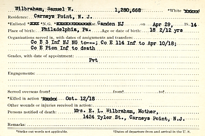 PRIVATE SAMUEL WELLS WILBRAHAM had lived near Merchantville NJ, where he was a member of the First Presbyterian Church of Merchantville. He had joined the Army in 1914. When sent overseas, he was member of the 1st Pioneer Infantry Regiment. He went overseas in July of 1917. Private Samuel Wilbraham was listed as missing in action on October 12, 1918. His body was not recovered, and he was presumed dead. He is memorialized on the Tablets of the Missing at Meuse-Argonne American Cemetery at Romagne, France. |