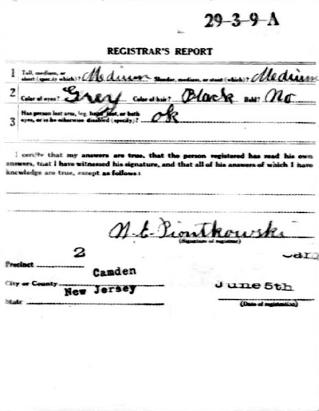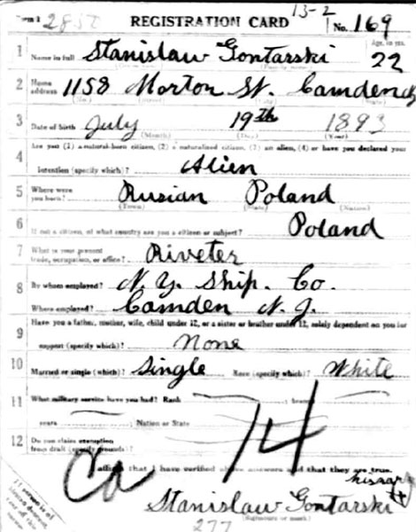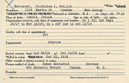 PRIVATE STANISLAW GONTARSKI was born on July 19, 1893 in a village called Lipki, in an area of Poland that was then part of the old Russian empire to Jan and Anna Gontarski. Stanislaw Gontarski emigrated to America in 1912, leaving from Hamburg aboard the steamship Kaiserin Auguste Victoria on July 12, 1912 along with his father Jan. Brothers Harovine (Herman) and Wladyslaw had already arrived and had settled in Camden. When he registered for the draft in 1917 Stanislaw Gontarski was living at 1158 Morton Street, and working as a laborer at the New York Shipbuilding Corporation shipyard on Broadway. His older brothers Harovine (Herman) and Wladyslaw also worked at New York Ship. Private Gontarski was drafted and was among the first local draftees to be called up. On September 20, 1917 he was sent to Camp Dix NJ. He was assigned to Company K of the 327th Infantry Regiment, and went overseas as a member of Company L, 327th Infantry Regiment. Private Gontarski was killed in action by a gunshot to the abdomen during the Battle of the Argonne Forest on October 12, 1918. He was survived by his father, Jan Gontarski of 931 Mechanic Street in Camden, and his brothers. |