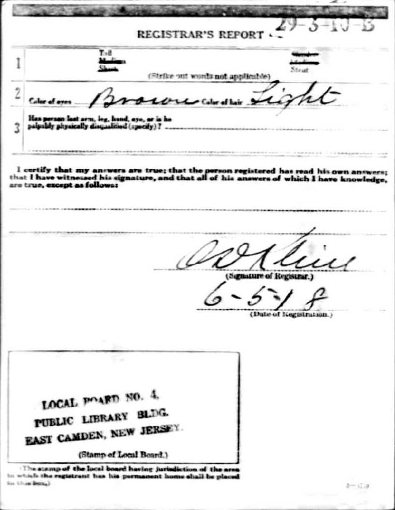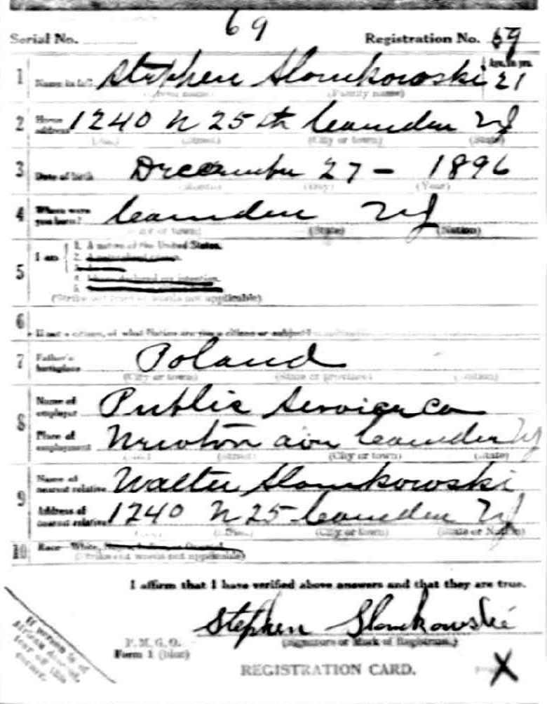 PRIVATE STEPHEN SLOMKOWSKI was born in what is now Poland on December 27, 1896. Stephen Slomkowski and his family were living at 1240 North 25th Street in Camden's Cramer Hill neighborhood when he registered for the draft on June of 1918. He had been working for the Public Service Company which operated trolley cars out of their facility on Newton Avenue. He was called up and inducted in the United States Army on August 28, 1918 and sent to Camp Meade, Maryland where he trained with the 154th Depot Company. On September 24 he was assigned to the 113th Engineer Regiment at Fort Benjamin Harrison, Indiana. Private Slomkowski fell victim to the Spanish influenza epidemic that killed millions in 1918 and 1919. He died of bronchial pneumonia on October 17, 1918. |