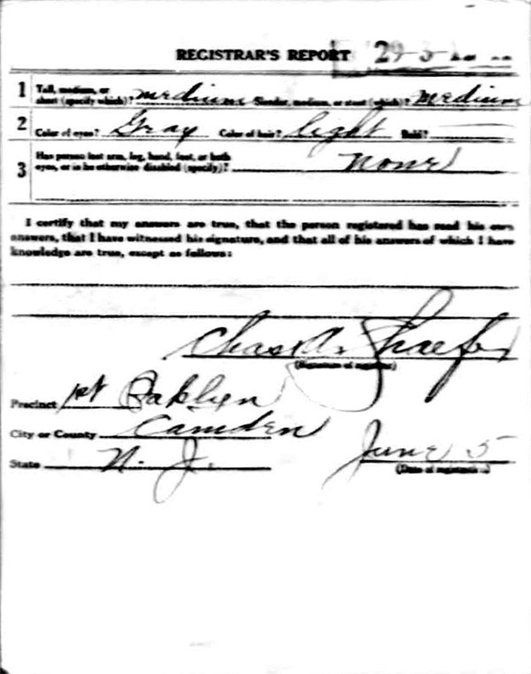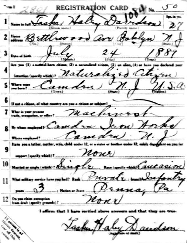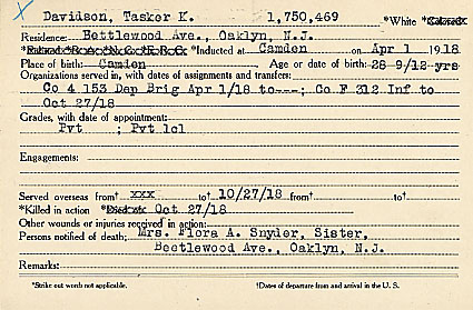 TASKER H. DAVIDSON was born in Camden NJ on July 24, 1889 to Noah A. and Rebecca Davidson. Noah Davidson was from Dagsboro Hundred in Sussex County DE. His father had been a farmer, but Noah and his brothers John and Isaac began working aboard ships during the 1860s. The Davidson family must have only recently moved to Camden, as Noah Davidson first appears in the City Directories in the 1890-1891 edition. His occupation was given as mariner. The Davidsons then lived at 610 North 5th Street in North Camden. Noah A. Davidson listed his profession in the 1900 census as sea captain. The Davidson then lived at 316 Penn Street in Camden. Besides Tasker the family consisted of step-sister Flora, 26, brother Noah A. Jr., 13, and younger sister Marie, 7. Sadly, Noah Davidson passed away during the 1900s. When the Census was taken in 1910, Flora Davidson had married George Snyder, also a seafarer. At the Snyder home, 318 New Jersey Avenue in Collingswood NJ, lived Rebecca Davidson, and her three children. Tasker Davidson was an apprentice at a pickle manufacturing company in Camden. He was a member of the Collingswood Presbyterian Church, which stood at Fern Avenue in Collingswood. When he registered for the draft on June 5, 1917, Tasker Davidson was working as a machinist at the Camden Iron Works at Camden NJ. He was living at 201 Bettlewood Avenue in Oaklyn NJ, and was unmarried at the time. Drafted in April of 1918, he left for France the following month with Company F, 312th Infantry after a short training at Fort Dix. Private Tasker H. Davidson, of Oaklyn NJ, was killed in action at Grand Pre, France, in the Argonne Forest, on October 27, 1918. He was buried at a little place called Senuc, France, prior to being permanently interred at the Meuse-Argonne American Cemetery at Romagne, France. He was survived by his sisters, Mrs. Flora Snyder and Marie Davidson, who were still on Bettlewood Avenue as late as 1930. |
