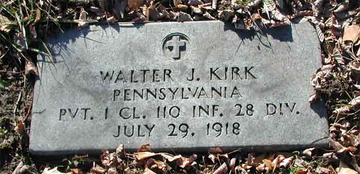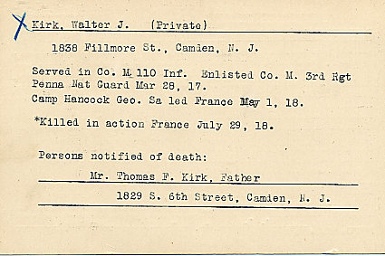 PRIVATE WALTER J. KIRK, of 1838 Fillmore Street, Camden NJ, was killed in action in France on July 29, 1918. He enlisted in Company M, 3rd Regiment, National Guard of Pennsylvania on March 28, 1917. He was sent with his company to guard tunnels when war was declared with Germany. Later he was sent to Camp Hancock GA for training and sailed for France on May 1, 1918. He was 18 years old and had won a sharpshooter's medal. Funeral services were held for him at the Church of the Sacred Heart at Broadway and Ferry Avenue on August 20, 1918. Walter J. Kirk was survived by his parents, Mr. and Mrs. Thomas J. Kirk, of 1838 Fillmore Street, Camden NJ, brothers Thomas and Maurice, and sisters Julia and Isabella. His brother Thomas became the first priest to come out of the Sacred Heart parish, and pastored at St. Mary's Roman Catholic Church in Gloucester City NJ for many years. After the war had ended, Walter Kirk was returned to the United States, and he was buried at Calvary Cemetery in Delaware Township (present-day Cherry Hill) NJ. |