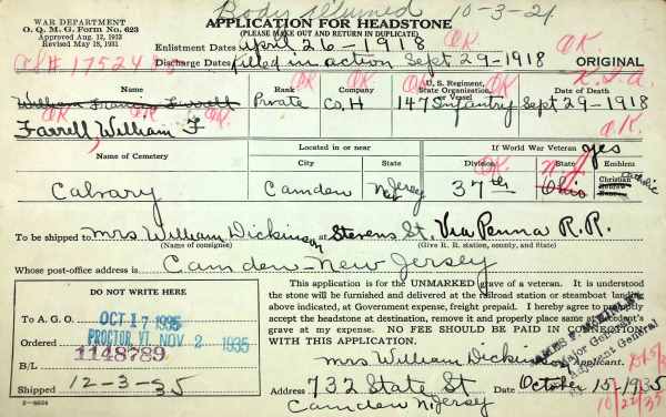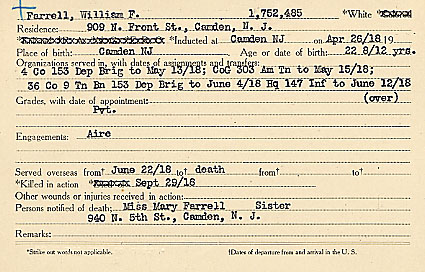 Argonne Forest battle on September 29, 1918. Private Farrell was survived by his sister,