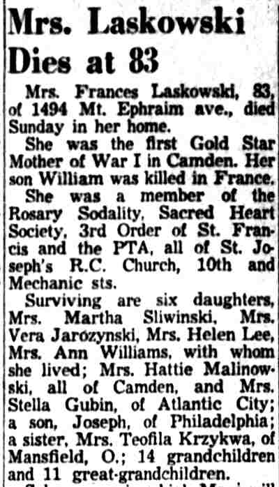 FIREMAN FIRST CLASS WILLIAM F. LASKOWSKI JR was born in 1890 to William and Francis Laskowski. His parents had came to America from Poland, and William Jr. may have been born there. William Laskowski Sr. operated a saloon as of the January 1920 census, when the family lived at 1151 Haddon Avenue. William Laskowski first went to sea around 1907, enlisting in the United States Navy in Philadelphia under the name William F. Laskon. While serving with the Navy in 1914, he was wounded in the arm and leg when Mexicans fired upon United States naval forces during the occupation of Vera Cruz, November 21-23, 1914. William Laskowski was an original member of the crew of the USS Jacob Jones DD-61 . Jacob Jones, a Tucker-class destroyer, was launched 29 May 1915 at the New York Shipbuilding Corporation shipyards in Camden NJ. She was was commissioned in February 1916. Also aboard the Jacob Jones was another career sailor, Machinist's Mate Second Class Henry Philip Favereau, who lived a few blocks away at 1307 Lansdowne Avenue. At one point around this time, the destroyer sprung a leak in Delaware Bay, William Laskowski went below to make repairs at the risk of his life. The Jacob Jones served along the East Coast during the next year and conducted war patrols in the same area for a month after the United States' April 1917 entry into the First World War. In May 1917, Jacob Jones , under the command of Lieutenant Commander David Bagley crossed the Atlantic to begin anti-submarine patrols and convoy escort work out of Queenstown, Ireland. She rescued survivors of several torpedoed ships during the next several months. Arriving Queenstown, May 17, she immediately began patrol and convoy escort duty in waters of the United Kingdom. On July 8 she picked up 44 survivors of the British steamship Valetta, the victim of a German U-boat. Two weeks later, while escorting British steamship Dafila, Jacob Jones sighted a periscope; but the steamship was torpedoed before an attack on the submarine could be launched. Once again a rescue ship, Jacob Jones took on board 25 survivors of the stricken Dapfila. On 19 October she picked up 305 survivors of torpedoed British cruiser Orama. On December 6, 1917 Jacob Jones was one of six destroyers returning from Brest after escorting a convoy to France. At 1621, as she steamed independently in the vicinity of the Isles of Scilly, her watch sighted a torpedo wake about a thousand yards distant. Although the destroyer maneuvered to escape, the high-speed torpedo struck her starboard side, rupturing her fuel oil tank. The torpedo was from the German submarine U-53. The crew worked courageously to save the ship; but as the stern sank, her depth charges exploded. Realizing the situation hopeless, Comdr. Bagley reluctantly ordered the ship abandoned. Eight minutes after being torpedoed, Jacob Jones sank with 64 men still on board. Of the 38 survivors, two were taken prisoner by the U-boat, others rescued by two British ships that responded to a radio signal sent out by U-53�s Captain, Hans Rose, and reportedly, Lieutenant Commander Bagley and five others managed to row ashore. William Laskowski was 27 when he was killed in action. He was survived by his parents, of 1151 Haddon Avenue, in Camden NJ, brothers John W. and Joseph S., and sisters Helen F., Anna, and Hedwig Laskowski. He had also listed an address at 1426 Atlantic Avenue, in Camden. |