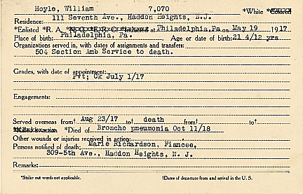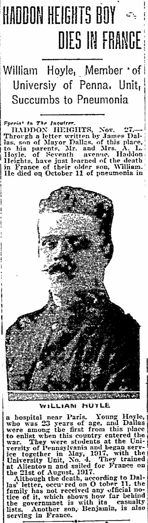 PRIVATE WILLIAM WILSON HOYLE was born in Pennsylvania on January 28, 1896, the son of Albertus L. and Mabel Wilson Hoyle. His parents were originally from Ohio, and had come to New Jersey in the 1890s. The Hoyle family were among the first to move into Haddon Heights, then still a part of Haddon Township NJ, as early as the summer of 1900, Their address in Haddon Heights was 111 Seventh Avenue. Albertus Hoyle worked as the superintendent of an office building. When the United States entered World War I in April of 1917, William Hoyle, then a student at the University of Pennsylvania, answered the call to the colors. He began service with University Unit No. 4 in May of 1917, He was sent to Allentown PA for training and sailed for for France on August 21, 1917. Serving with Section 504 of the United States Army Ambulance Service, William Hoyle died of pneumonia on October 11, 1918. It should be noted that the records for the Mothers Pilgrimage list his rank as cook, rather than clerk, and he is listed as a Private in the book "Camden County in the Great War". William Hoyle was survived by his parents, a brother, Benjamin Hoyle, and two sisters, Eleanor Mary and Dorothy Hoyle. The Hoyle family was still on Seventh Avenue in Haddon Heights in 1930, when his mother applied for the 1930 U.S. World War I Mother's Pilgrimage to France. It should be noted that the records for the Mothers Pilgrimage list his rank as cook, rather than clerk, and he is listed as a Private in the book "Camden County in the Great War". |