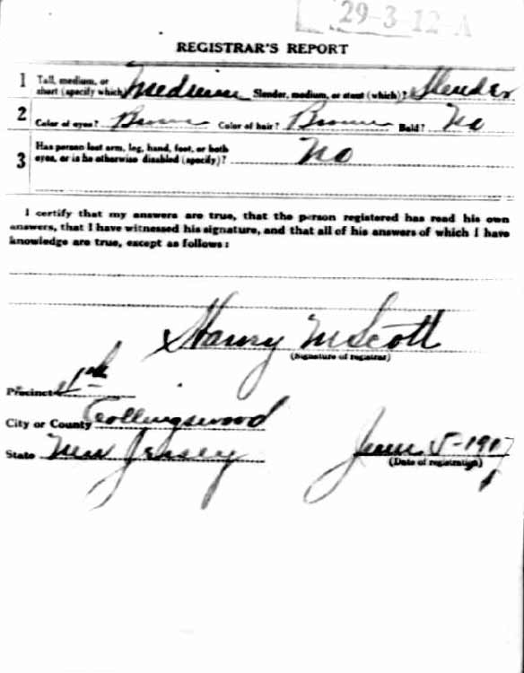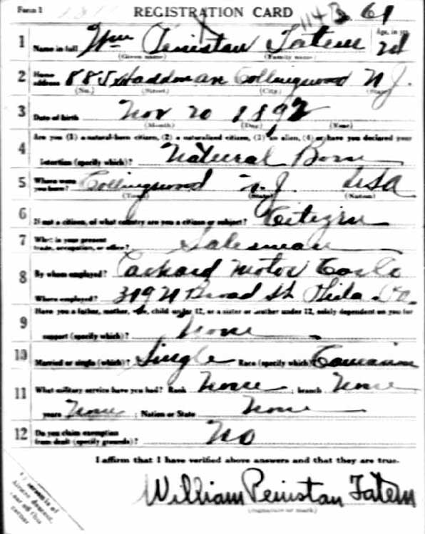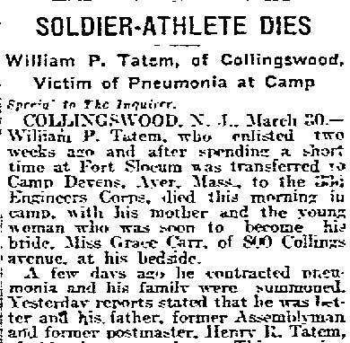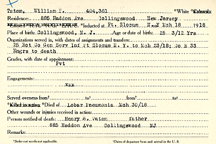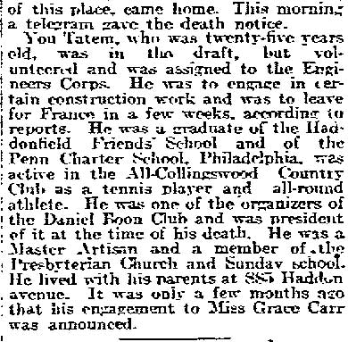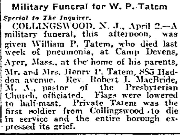 PRIVATE WILLIAM PENISTON TATEM was born in Collingswood NJ on November 29, 1892. He was the son of Henry P. and Kate Ann Tatem, and lived at 885 Haddon Avenue, Collingswood NJ. He was a member of the Collingswood Presbyterian Church, which stood at Fern Avenue in Collingswood. His father was a real estate agent. William Tatem was working as an automobile salesman at a Packard dealership on North Broad Street in Philadelphia when he registered for the draft on June 5, 1917. William Tatem enlisted in the United States Army on March 1, 1918, at the age of 25. On March 18 he was sent to Fort Slocum NY. After a few days he was sent to Camp Devins Massachusetts, where he was assigned to Company B, 33rd Engineer Regiment. Private Tatem died of pneumonia at Camp Devins on March 30, 1918. William Tatem was survived by his parents, five sisters, Buelah, Alice M., Gladys, Achsa W., and Katherine, and a brother, Henry P. Tatem Jr. The Tatem family was still at the Haddon Avenue address as late as April of 1930. The Tatem-Shields Post American Legion Post 17 at 622 Atlantic Avenue in Collingswood NJ is named in part for William P. Tatem. The William P. Tatem Elementary School in Collingswood was named in his memory. |