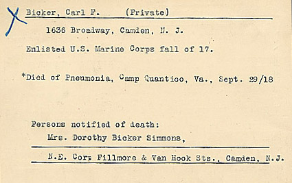 PRIVATE CARL FREDERICK BICKER was born in Camden NJ, the son of Dr. Francis. J. Bicker M.D. and his wife, the former Theresa Trainor Tuttle. His father was born in Pennsylvania, and had come to Camden from Philadelphia in the 1880s. In 1887 he was living and working as a drug clerk for Dr. John W. Donges at 1801 Broadway. Francis Joseph Bicker eventually was licensed as a medical doctor. In 1910 the Bicker family resided at 1700 Fillmore Street. Carl Bicker was attending college at Winona Lake IN in the fall of 1917 when he dropped out in order to enlist in the United States Marine Corps. He was stricken with pneumonia and died at Quantico VA on September 29, 1918. His parents having preceded him in death, Private Bicker was survived by his brother, Francis J. Bicker Jr., a sister, Katherine Bicker, his aunt, Mrs. Florence Bicker Burroughs, and her husband Harry D. Burroughs, of 1634 Broadway, in Camden NJ. |