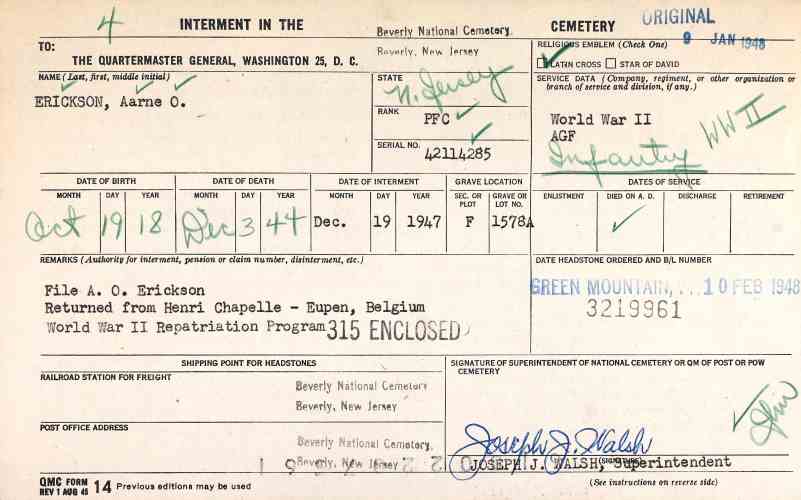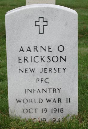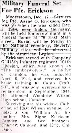PRIVATE FIRST CLASS AARNE OSCAR ERICKSON, born in Pennsylvania on October 18, 1918, was the son of Eric and Signe Erickson. His father had been born in Sweden, his mother in what became Finland after the Russian revolution of 1917. The family moved about quite a bit before and after he was born. An older brother, Fred, had been born in Massachusetts in 1916 and another borthr, Charles, in New Jersey around 1917. The 1920 Census shows the family in Solebury Township, Bucks County, Pennsylvania. Eric Erickson worked as a farm laborer to support his family. The Ericksons appear in the 1928 Camden City Directory at 27 Morse Street in East Camden, a two story frame house located on Morse between Watson and Berwick Streets. The family was still living in Camden in the early 1930s. Aarne O. Erickson completed two years of high school at Woodrow Wilson High School on Federal Street. By 1941 Aarne O. Erickson and his mother were living at 1150 Penn Street, Camden NJ. Aarne Erickson on April 26, 1941 married Catherine Christina Baldwin of 435 Chambers Avenue at Epiphany Evangelist Lutheran Church in Camden. They had an infant son William Aarne. The Erickson family lived at 13 East Collingswood Avenue, in Oaklyn NJ. Private Erickson had worked for the Mathis shipyard in Camden NJ prior to entering the Army on April 6, 1944. He was sent overseas as a replacement in September of 1944 and assigned to Company G, 413th Infantry Regiment, 104th Infantry Division. Private Erickson was killed in action on December 3, 1944 in Germany on the last day of the battle to take the city of Inden. He was survived by his wife, child, and mother, and by two brothers, Charles, of Camden NJ, and Robert of Los Angeles CA. Upon news of his death, funeral services for Aarne Erickson were held at the Epiphany Evangelist Lutheran Church at North 7th and Market Streets in Camden NJ. Aarne Erickson was brought home to New Jersey in December of 1947. He was buried on December 19, 1947 at Beverly National Cemetery in Beverly NJ. As evidenced by a newspaper article and the Army's Interment Control Form, the date of his death which is inscribed on his headstone is in error. |