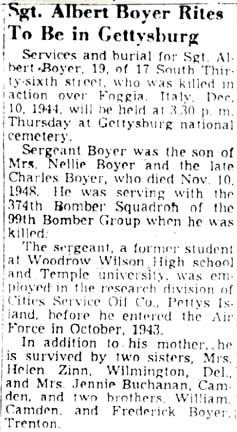 SERGEANT ALBERT BOYER was born in September of 1925 to Charles and Nellie Boyer of Camden NJ. According to the 1930 Census, Charles Boyer had come to America from Poland in 1906, his wife Nellie arrived in 1913 from Russia. The Boyers married around 1915, and lived in Pennsylvania through 1918. By 1921 the family had moved to New Jersey. The family lived at 135 State Street in Camden NJ as of 1930, when Charles Boyer was working in a hardwood shop as a finisher. They later moved to 17 South 36th Street in East Camden. The family included sisters Helen and Jennie, and brothers William F. and Frederick. Albert Boyer was a graduate of Woodrow Wilson High School in Camden NJ. He attended Temple University in Philadelphia PA, and was working for the the research division of Cities Service Oil Company (present-day CITGO) on Petty's Island when he enlisted in the Army in October of 1943. Albert Boyer was killed in action over Foggia, Italy on October 10, 1944, when the B-17 bomber he was serving in, nicknamed the Lady Lynn, went down. His death was reported in the March 6, 1945 edition of the Camden Courier-Post. He was survived by his parents and siblings. Albert Boyer was brought home after the war. He was buried at Gettysburg National Cemetery in Gettysburg PA in 1949. |