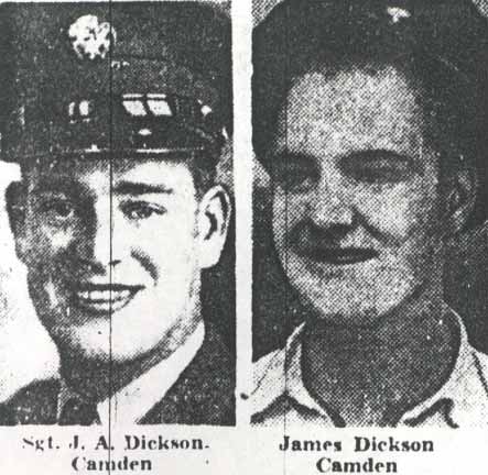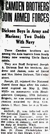 PRIVATE ANDREW FREDERICK DICKSON was born in 1919 to David F. and Helen Anna Olsen Dickson, of 507 9th Street in Gloucester City NJ. His father was then an erector at a shipyard, he later worked as machine operator at the Haddon Press bookbindery in Camden, he also worked for a time in the hull department at the New York Shipbuilding Corporation, as well as being known as a string band music instructor in Philadelphia PA. By 1930, the family had moved to 1913 Carman Street in the East Camden section of Camden NJ. Besides Andrew, the family included sisters Marie, Ruth, and Helen, as well as brothers Joseph and James. Andrew F. Dickson had been a member of the New Jersey National Guard prior to the mobilization of 1940. He was discharged in November of 1941, and was called back to active duty two months later. When the war broke out, the Dickson family was living at 718 Cedar Street in North Camden. All the Dickson brothers went to serve in the armed forces. Joseph Dickson had also been in the National Guard, and was serving in Washington by May of 1942. James Dickson enlisted in the Marines at the age of 17 on January 20, 1942. Andrew Dickson was also serving in Washington in May of 1942. Andrew Dickson's father passed away on January 31, 1943 at the age of 47. At the time, brother James was in the South Pacific, brother Joseph was serving in Georgia, and Andrew Dickson was stationed in California. Andrew Dickson was still in the nation's service when he was killed in an accident involving a coal truck in 1945, in Atlantic City NJ. He was survived by his mother and his siblings. |