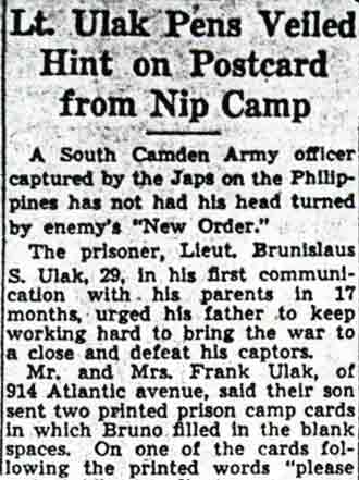 He then went on to attend college at Lehigh University, where he graduated with a degree in Electrical Engineering, and was a member of the Tau Beta Pi and Eta Kappa Nu fraternities. Bruno Ulak entered the Army early in 1941, and was commissioned as an officer. At the outbreak of hostilities in December of 1941, he was 27 years old. He was stationed at Manila in the Philippine Islands, and was captured by the Japanese when American forces fell on the island of Bataan.. Lt.