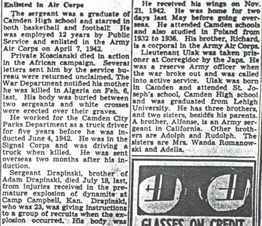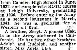 LIEUTENANT BRUNO ULAK was born in Camden NJ on September 2, 1914 to Mr.