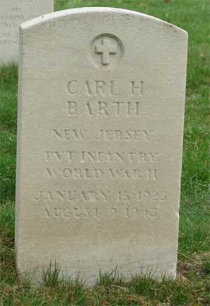PRIVATE CARL H. BARTH was born on January 15, 1923 to Charles Henry Barth and the former Mable E. Wintrode. It appears that illness took Charles Barth in the 1930s, as the family was scattered in the 1930 Census and the 1940 Census shoes him to be deceased. The 1940 Census shows Carl H. Barth living with his widowed mother Mable, brother Joseph N. and sisters Thelma and Charlotte at 215 Linden Street in Camden, New Jersey. Carl H. Barth was then working for the Civilian Conservation Corps. Carl H. Barth enlisted in the Army on January 15, 1941. He trained at Fort Slocum NY until March of that year, and was then sent to Hawaii, where he served until December of 1942, when he was sent to Guadalcanal. He was killed in action while serving in the United States Army in the South Pacific on August 9, 1943. Carl Barth was survived by his mother, Mrs. Mable E. Barth, of 215 Linden Street in Camden NJ. His body was returned home aboard the USAT George W.G. Boyce in 1948, and he was buried at Beverly National Cemetery in Beverly NJ on June 24th of that year. |