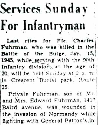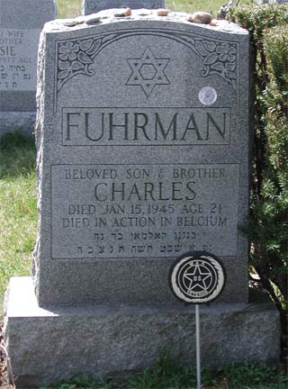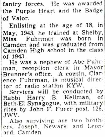 PRIVATE FIRST CLASS CHARLES J. FUHRMAN was the son of Edward and Hannah Fuhrman. He was born in Camden NJ and attended Camden High School, not far from his home in the Parkside section of Camden. He was graduated as a member of the Camden High School Class of 1942. The Fuhrman's had lived at 1247 Kenwood Avenue when the census was taken in 1930 before moving to 1134 Langham Avenue, where they lived in the mid 1940s. His family was in the retail furniture business, and owned and operated the N. Fuhrman Co. furniture store at 933-937 Broadway in Camden for many years. As a youth, Charles Fuhrman was active in youth civic affairs. Inducted into the Army at the age of 18, in the fall of 1943, Charles Fuhrman trained at Camp Shelby MS. He was wounded on D-Day, and returned to duty after he recovered from his injury. He was killed in action while serving in Belgium on January 15, 1945. Private Charles J. Fuhrman was initially buried in Europe. His body was returned to the United States and he was buried at Crescent Burial Park in Pennsauken NJ. Besides his parents, he was survived by two brothers, Corporal Leonard Fuhrman who was also serving in Europe, and Joseph Fuhrman; an uncle, Abe Fuhrman, then clerk to Camden Mayor Bruner; a cousin, Clarence Fuhrman, musical director of radio station KYW, in Philadelphia; and several other aunts, uncles, and cousins. His parents had by this time moved to 1417 Baird Avenue in Camden. |