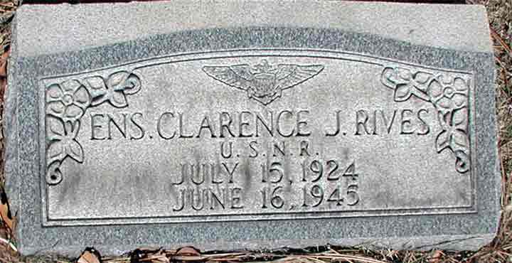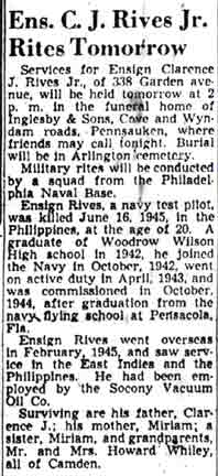 ENSIGN CLARENCE JAMES RIVES JR. was born in Camden NJ on July 15, 1924 to Clarence James and Miriam M. Rives. In 1930 he lived along with his parents and sister Mary in the home of his grandparents, Mr. and Mrs. James H. Ketchum, of 3618 Westfield Avenue in Camden NJ. His entire early life was spent in that East Camden neighborhood, his parents eventually moving to a home at 226 North 32nd Street. He graduated in 1942 from Woodrow Wilson High School on Federal Street, in Camden, and worked for the Socony-Vacuum Oil Company prior to entering the Navy in October of 1942. He was activated in April of 1943. Trained as a pilot at Pensacola FL Clarence Rives won his wings and commission in October 1944. Ensign Rives went overseas in February of 1945. He was killed in the Philippines on June 16, 1945. He was test flying an FM-2 Wildcat (Bureau Number #74566). The engine failed shortly after takeoff and he spun in to the ground. His death was reported in the July 20, 1945 edition of the Camden Courier-Post. Clarence Rives was survived by his parents, Mr. and Mrs. Clarence James Rives Sr., and his sister, Miriam, and grandparents, Mr. and Mrs. Howard Whiley, all of Camden NJ. Clarence Rives Jr. was brought home after the war. He was buried at Arlington Cemetery in Pennsauken NJ, where he now rests next to his parents. |