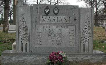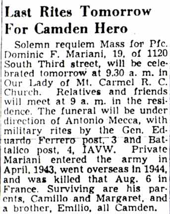 PRIVATE FIRST CLASS DOMENICK F. MARIANI was born April 28, 1924 to Camillo and Domenica (Margaret) Mariani. He lived at 1120 South 3rd Street in Camden NJ. He attended public schools in Camden NJ, and had graduated from Junior High School. Domenick Mariani was inducted into the United States Army in April of 1943. In August of 1943 he was stationed at Fort Knox KY. He was killed in action in France on August 6, 1944. After the war, his body was returned to the United States, and he was buried at New Camden Cemetery on March 31, 1949. Survived by his parents and brother Emilio, he rests with his parents, brother Ernesto, and other family members. |