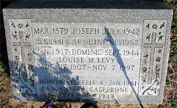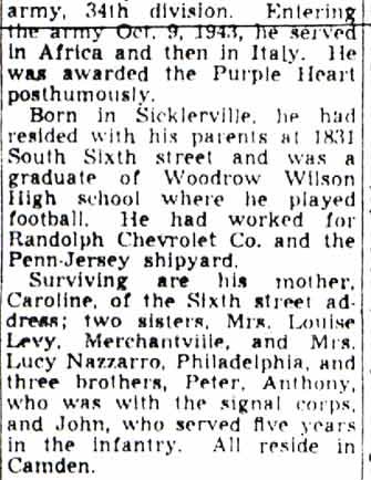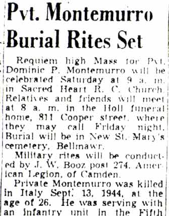 Prior to his induction into the United States Army, Dominic Montemurro had married, and lived with his wife Rose at 495 Newton Avenue. He had worked for at the Randolph Chevrolet dealership on Haddon Avenue in Camden, and the Penn-Jersey Shipyard, also in Camden NJ. His father, Joseph Montemurro, passed away in 1942, and was buried at New St. Mary's Cemetery in Bellmawr NJ. After serving in North Africa, Private Montemurro went to Italy as a member of the 34th Infantry Division. He was killed in action on September 13, 1944 during the two-week long battle for control of Hill 810, north of Livorno, a key point in the Gothic Line fortifications that the German army had constructed to defend northern Italy. Dominic Montemurro was survived by his wife Rose, mother Caroline, sister Lucy, and brothers Peter, John, and Anthony. John Montemurro was at the time serving in France, and Anthony was serving at Fort Monmouth NJ. He was brought home to New Jersey, and was buried by his father at New St. Mary's Cemetery in Bellmawr. He now rests with his parents and sister, Louise Levy. |