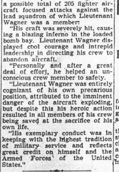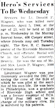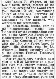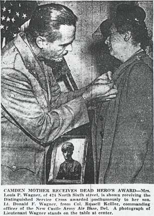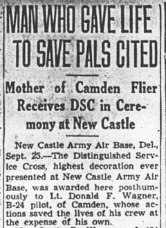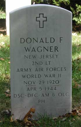 SECOND LIEUTENANT DONALD F. WAGNER, was grew up in Burlington County NJ and graduated from Riverside High School in Riverside NJ in 1938. Born on November 29, 1920 he was the only child of Mr. and Mrs. Louis P. Wagner. The Wagner family moved to a home at 424 North 6th Street in Camden NJ shortly after Donald Wagner graduated high school. He took a job at the RCA-Victor plant in Camden, a short walk from his home. Joining the war effort, Donald Wagner entered the Army Air Force, and was trained as a pilot, flying a -24 Liberator. He was assigned to the 720th Bomber Squadron of the 450th Bomber Group, which was based in Italy. On his 15th mission, the 450th Bomber Group attacked the railroad marshaling yards at Ploesti, Romania. At 2:30 in the afternoon, his plane was attacked by German fighters and were on fire. The nose gunner was killed instantly and another was wounded. Don gave the order to bail out. As the crew were bailing out the plane went into a dive. He went back to the cockpit and pulled the plane level so that all the men could get out safely. Before he could get out the plane exploded. The seven other men all bailed out safely and were mad prisoners of war, although one man died of the wounds he got in the plane and when he landed. Upon confirmation of his death, a memorial services for Donald Wagner were held at the Moravian Church in Riverside NJ on October 15, 1944. On September 25, 1945, The Distinguished Service Cross was awarded posthumously to Lt. Wagner in a ceremony held at New Castle Army Air Base in New Castle DE. Donald Fredrick Wagner was brought home to New Jersey after the war. On June 8, 1949 he was buried in the Distinguished Service section of Beverly National Cemetery in Beverly NJ. For his gallant actions, he received the Distinguished Service Cross, our nation's second highest award for valor, along with the Distinguished Flying Cross, the Air Medal, and the Purple Heart. Two friends of his have named their sons after him. |