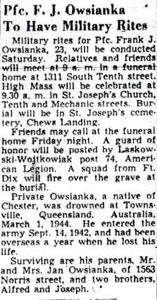 Camden. After the war, his body was returned home, and he was buried at St. Joseph Cemetery in Gloucester Township NJ on March 13, 1948. His brother Joseph Owsianka served in the Navy during World War II, and owned Martin & Owens Cafe at 1400 Sheridan Street in Camden NJ from the late 1940s until the 1960s. |