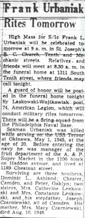 the A&P Supermarket on Haddon Avenue in Camden. Frank Urbaniak was brought home aboard the USAT Dalton Victory early in 1949. After a funeral at the Stanley Ciechanowski Funeral Home at 1309-11 South 10th Street in Camden, he was buried at New Camden Cemetery in Camden NJ on March 19, 1949. |