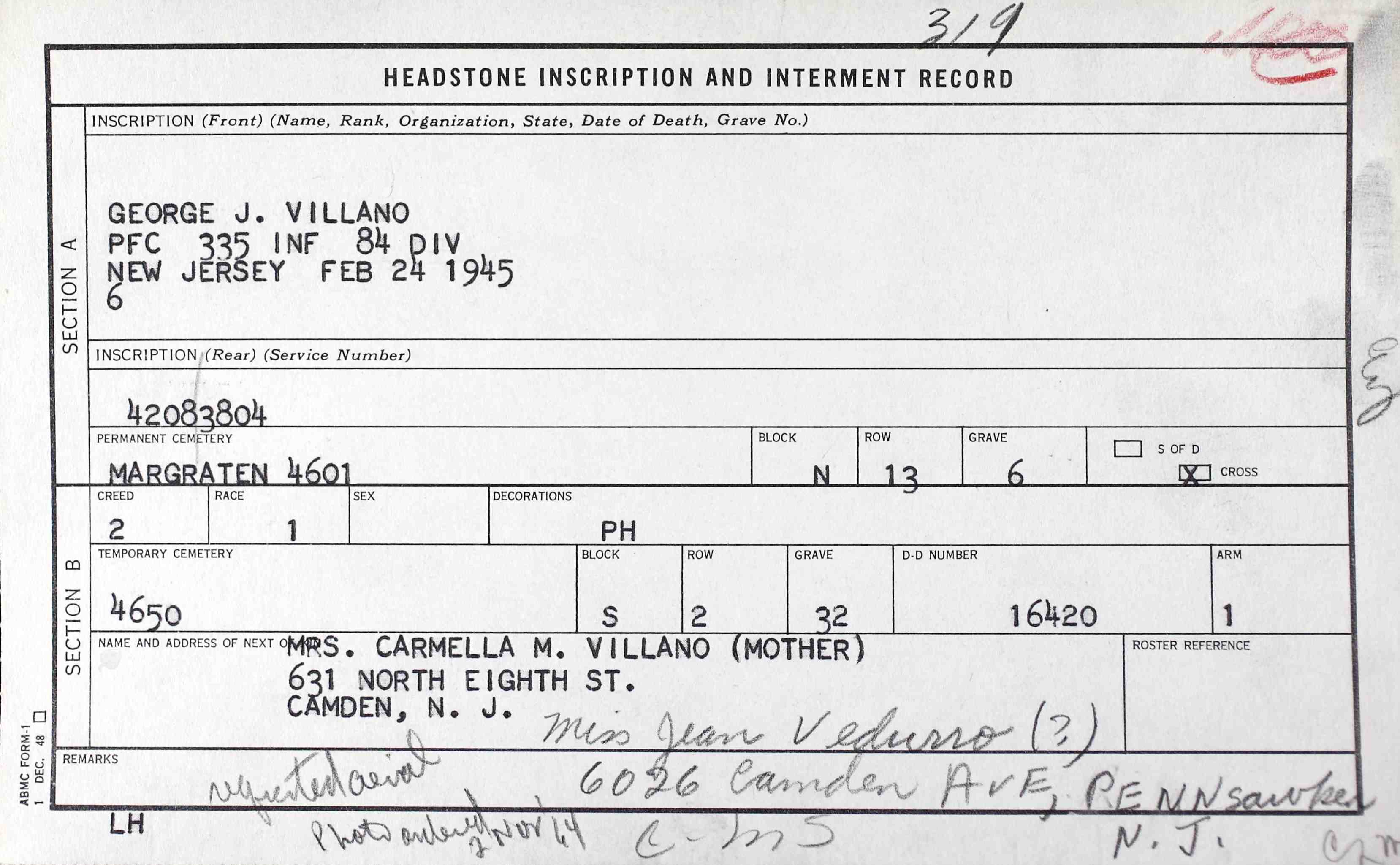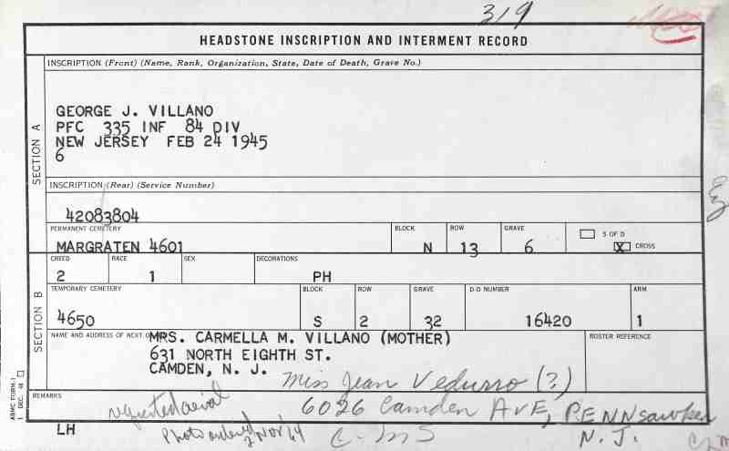 PRIVATE FIRST CLASS GEORGE J. VILLANO was born in New Jersey in 1920 to Rocco and Carmella "Millie" Villano, one at least six children in the Villano family. He grew up in North Camden, where his family lived, first at 623 North 6th Street, and by April of 1930 at 631 North 8th Street. His mother was an active member of the Church of the Holy Name Parent-Teacher Association (P.T.A.). George J. Villano was drafted and inducted into the United States Army on July 24, 1944 at Camden NJ. Prior to his time in the Army, he had worked as a machinist for RCA in Camden. He lived at 828 Birch Street in North Camden with his wife Kathleen. Private First Class Villano died of wounds received in combat in on February 25, 1945 in Holland. He was survived by his wife, Kathleen Villano; his mother, of 631 North 8th Street Camden NJ; and two brothers, Anthony who was serving in the 8th Air Force, and Gerard who was with the 29th Infantry Division. George J. Villano was 24 at the time of his passing. |