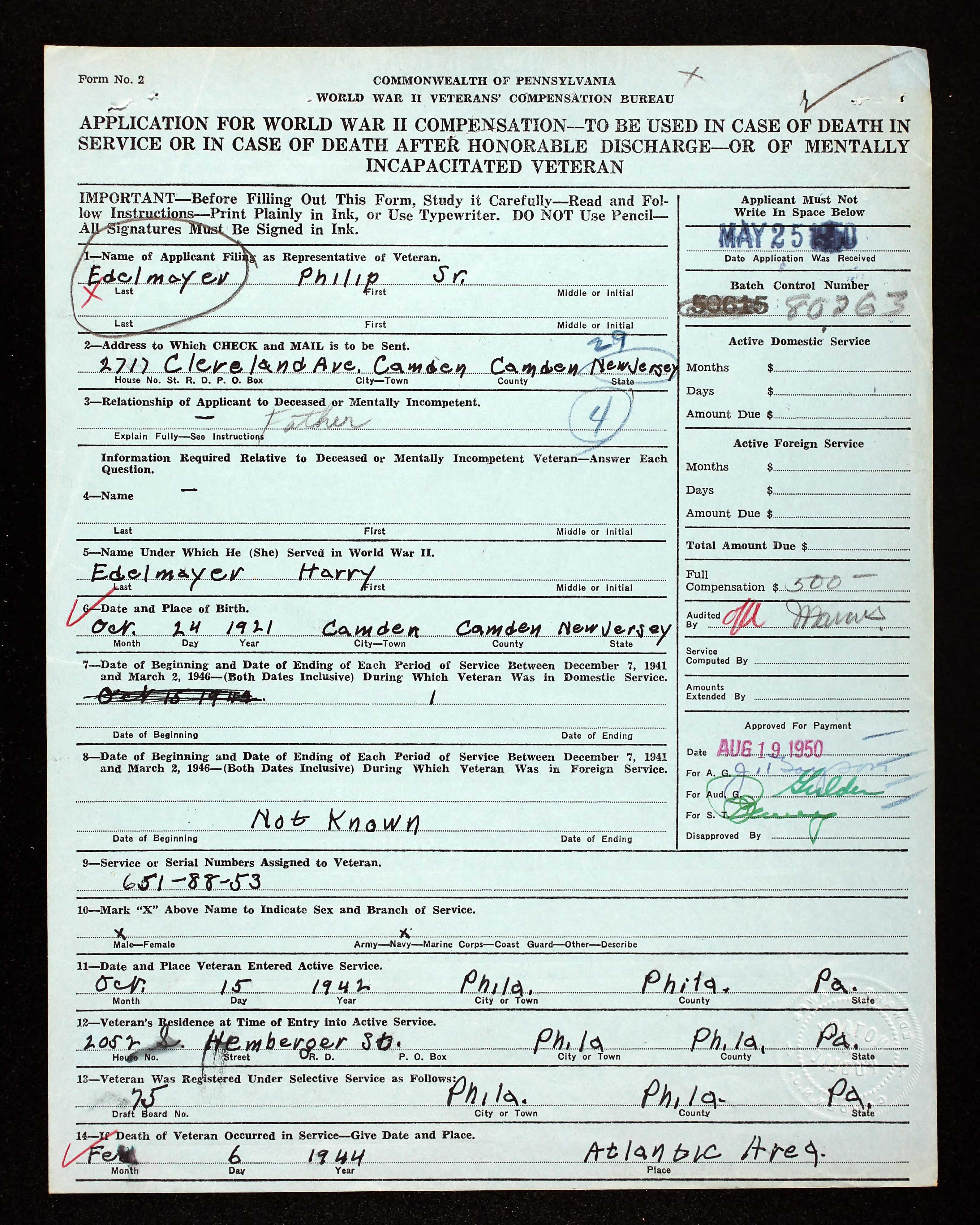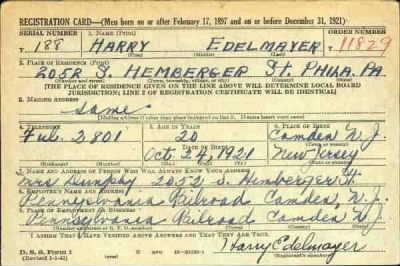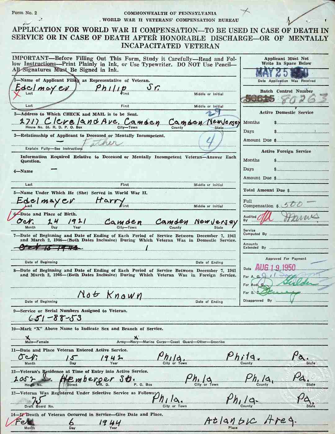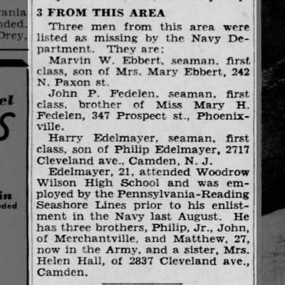SEAMAN FIRST CLASS HARRY EDELMAYER was born in 1921 to Philip and Elizabeth Edelmayer. Philip Edelmayer worked as a butcher. The Edelmayers had come from Hungary shortly before America's entrance into World War I. The family, which beside Harry include lived at 2717 Cleveland Avenue, in the Cramer Hill section of Camden NJ. The Edelmayers belonged to the St. Anthony of Padua Roman Catholic Church. His mother had emigrated to America from Hungary shortly before America entered World War I. A fine baseball player, Harry Edelmayer played for the Pierce Athletic Association, a neighborhood team. After enlisting in the United States Navy, Harry Edelmayer served aboard merchant ships as part of the Naval Armed Guard. On February 5, 1943 Harry Edelamayer was serving aboard the SS West Portal, part of convoy SC-118. Of the 69 ships sailing in convoy SC-118, 11 were sunk when 20 U-boats attacked. The West Portal was torpedoed and sunk by U-413 in the North Atlantic, 600 miles SSW of Iceland (55.18 N/26.29 W), taking 40 of the crew and 12 of the Armed Guard, including Harry Edelmayer, to their doom. Harry Edelmayer was survived by his parents, sister Helen and brothers John, Philip, and Mathew. |
