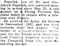 STAFF SERGEANT HENRY ALFRED POPIOLEK was born in Camden NJ on October 28th, 1920 to Joseph and Rozalia Popiolek, of 1282 Morton Street, Camden NJ. He attended St. Joseph School and Camden Vocational School. He later lived at 1205 Lansdowne Avenue in Camden. He worked for the Campbell Soup Factory in Camden NJ. Henry Popiolek entered the Army in September of 1942. Qualifying for flight duty, he trained as a tail-gunner, and served with a bomber squadron flying the B-24 bomber. He shipped out to a base in England in May of 1943. On May 23rd, 1944, while on his 48th mission, the 446th raided the airfields at Orleans, France. The airfield was bombed with good results. One plane, "Wee Willie" (42-7583), was lost when it appeared the bombs were dropped through the closed bomb-bay doors. A piece of the damaged door struck and damaged the plane's tail, causing a spin from which the pilot could not recover. Henry Popiolek and the other 9 member of his crew were killed. Henry Popiolek was survived by his parents, a brother, Seaman Second Class Benjamin Popiolek USN, and a sister, Mrs. Adele Baus, of Camden NJ. A Mass was held for him at St. Joseph's Church in Camden on September 16, 1944. His death was reported in the September 15, 1944. After the war Henry Popiolek was brought home to New Jersey, and he rests in St. Joseph Cemetery on Lower Landing Road in Blackwood, Gloucester Township NJ, next to his parents, and a sister, Dorothy Popiolek, who had preceded him in death. |