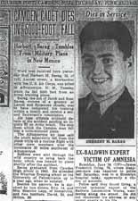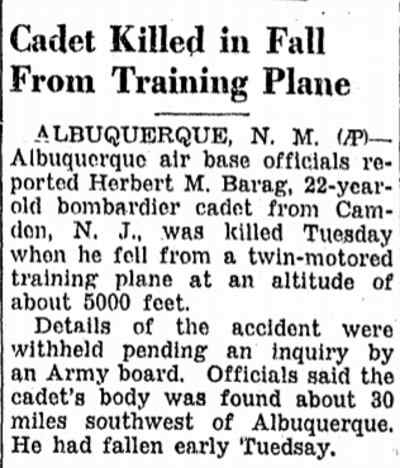 ALBUQUERQUE, N. M., June 24 (U.R) An Army board of inquiry today began an investigation into the death of Bombardier Cadet Herbert M. Barag, 22, Camden, N. J., who fell 5,000 feet to his death from a twin-engined training plane. The" Albuquerque air base said the youth apparently fell from the plane while on a routine flight with other crew members over the mountains 30 miles southwest of Albuquerque. Soldiers were sent through the wild country to bring back the body which was located by plane shortly after the accident late yesterday. The youth's body will be sent to Philadelphia at the request of the parents, Mr. and Mrs. Jacob Barag. |