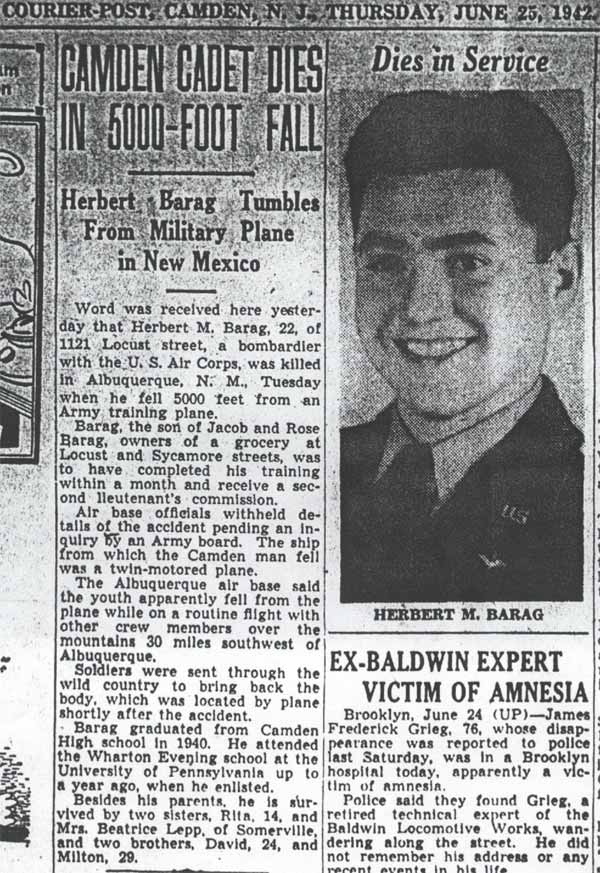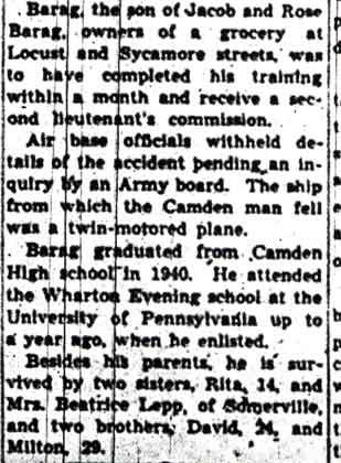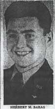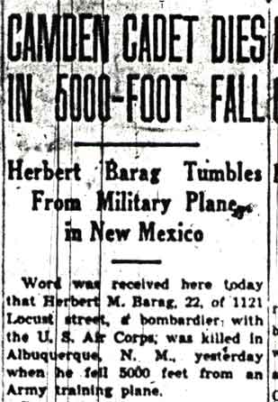 AVIATION CADET HERBERT M. BARAG was born in New Jersey in November of 1919. He grew up at 1121 Locust Street in Camden NJ. Born to Jacob Barag and Rose Ruttenberg Barag. Herbert Barag he was one of five children. The family had moved to Camden around 1913, and in 1930 Jacob Barag gave his occupation to the census taker as a junkman. By 1942, he was the proprietor of a grocery at Locust & Sycamore Streets in Camden, according to the Camden Courier-Post newspaper. Herbert Barag grew up and attended school in Camden, graduating from Camden High in 1940. After high school, he attended the Wharton Evening School at the University of Pennsylvania for a year, before enlisting in the Army Air Corps on January 19, 1942 at Trenton NJ. Herbert Barag was training as a bombardier in Albuquerque NM when he was killed in a training accident 30 miles southwest of town. He would have been commissioned as a 2nd Lieutenant within 30 days of the accident, had he lived. Besides his parents, he was survived by sisters, Beatrice and Rita, and by brothers Milton and David Barag. The Furer-Barag Post of the Jewish War Veterans was named in part for Herbert Barag. |