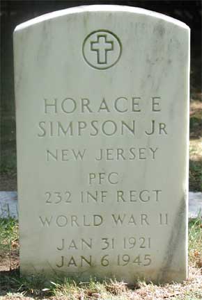 PRIVATE FIRST CLASS HORACE E. SIMPSON JR. was born January 31, 1921. He had lived at 604 North 6th Street in 1933. He later moved to 717 Clinton Street in Camden NJ. His father had served in World War I, as a Private First Class in Company H, 113th Infantry, 29th Infantry Division. Horace Simpson was a member of the New Jersey National Guard, and was activated in 1940. Sent overseas, he was killed in action during fighting along the Rhine River, near Strasbourg, on January 6, 1945. Originally declared missing in action, his body was recovered at a later date, and his status was changed to killed in action on May 4, 1945. He was survived by his parents. Horace Simpson was returned home to New Jersey after the war. He rests at Beverly National Cemetery in Beverly NJ, where he was buried on July 20, 1949. His parents are also buried nearby, on the cemetery grounds. |