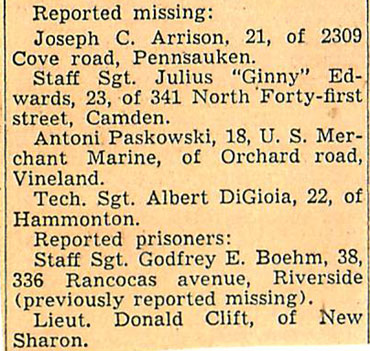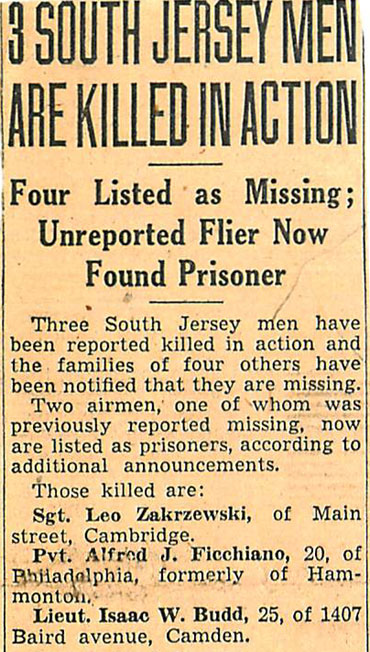 LIEUTENANT ISAAC WALTER BUDD was born in Camden NJ in 1918 to Hiram Epright and Margaretta Budd of 1407 Baird Avenue. His father was the president of the City Line Brick and Lumber Company, founded in 1890 by his great-uncle Hiram and grandfather Isaac W. Budd. Prior to founding the brick business had been Budd brothers had worked as stone masons, operated a feed and and grain business, and were connected, through Isaac's brother-in-law Frank, to a successful lumber business in Camden, William C. Scudder and Son Lumber, at Front and Arch Streets. The brick business prospered, and the Budd's built two of the first houses in Parkside, at 1401 Baird and 1407 Baird Avenue, the corner of Baird and Kenwood Avenues, early in the 20th century. Isaac Budd, "Ike" to family and friends, was the one of six children, and he grew up and went to school in Camden. Besides Isaac was older stepbrother Harry, and the younger children, Geraldine, William, Margaretta, and Hiram. Isaac graduated from Camden High School. He attended Wenonah (NJ) Military Academy, and was a graduate of Swarthmore College in Swarthmore PA. Isaac W. Budd entered the Navy prior to Pearl Harbor. He trained as a pilot, and part of his training included take-offs and landings from Camden's Central Airport. After he was commissioned and awarded his wings, he served as a flight instructor at Miami FL. On January 19, 1943 he married Miss Jeanne Coleman. Isaac Budd also was stationed at Whidbey Island and Pasco in the state of Washington prior to being sent to the Pacific for duty as a naval fighter pilot in November, 1943. A member of Fighter Squadron VF-39, flying Grumman F6F Hellcats, he was shot down while strafing Japanese forces at Mili Island on March 7, 1944. His plane crashed into the sea, and neither Lt. Budd or the plane were recovered. Isaac Budd was survived by his mother, siblings, and his wife, Jeanne Coleman Budd, all of the 1407 Baird Boulevard address. All of his brothers were serving in the Navy at the time. Isaac Budd was related by marriage to the Hineline, Wilson, and Haines families. His Aunt Alberta Budd was married to Frank J. Hineline, president of the Camden Lime Company. His first cousin, Frank B. Hineline was married to Elizabeth Haines, daughter of Dr. Rowland Ivins Haines and neice of Admiral Henry B. Wilson and banker Philip Wilson; their father was H.B. Wilson Sr., for who a school in Camden was named after. |