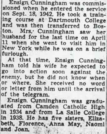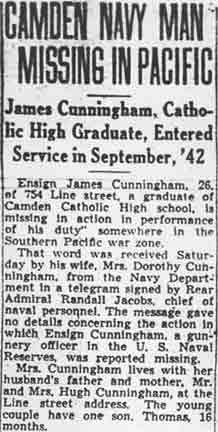 ENSIGN JAMES J. CUNNINGHAM was born in New Jersey about 1916 to Hugh and Elizabeth Cunningham. He grew up in Camden, in a row house at 754 Line Street, near the corner of Line Street and Newton Avenue. Of the six Cunningham children, he was the only son. Hugh Cunningham followed the sea as a profession, in 1930 he listed his occupation as Marine Engineer. James Cunningham was a 1934 graduate of Camden Catholic High School in Camden NJ, and from LaSalle University in 1938. He had wed prior to the war, and with his wife Dorothy, had one son, Thomas Cunningham, early in 1942. James J. Cunningham entered the United States Navy on September 18, 1942, and was commissioned as an ensign. After training at Dartmouth College in New Hampshire, and was then stationed the Naval base in Boston MA. He also saw duty at the Naval Armed Guard Center at Brooklyn NY. He served was an officer on the naval Armed Guard stationed on merchant vessels crossing the Atlantic. The Armed Guard were not guards, as such. They were United States Navy gun crews consisting of gunners, coxswains and boatswains, radiomen, signalmen, an occasional pharmacist, and toward the end of the war a few radarmen serving at sea on merchant ships. The Merchant Marine ran the ships and the Armed Guard we provided gunnery protection and communications services. Our crews were small, our hearts were large. The Merchant Marine crew took the same risks and many of them had been rejected by the military services or were requested to stay in the Merchant Marine where they were badly needed. The Merchant Marine occasionally served as loaders or ammunition handlers but very seldom manned a gun. James Cunningham received a brief liberty during the second week of April, 1943, when his wife was able to visit him in New York on April 10th and 11th. On April 12, 1943, Ensign Cunningham sailed once again, aboard the Liberty Ship SS ROBERT GRAY, operated by the the Army Transportation Service. The SS ROBERT GRAY had been built at Portland Oregon by the Oregon Ship Building Corporation. One of the first Liberty Ships, her keel was laid down on May 31, 1941. The SS ROBERT GRAY was named for Captain Robert Gray (1755-1806), who as captain of the "Columbia" was the first American to circumnavigate the globe. He was the discoverer of the Columbia River in 1792, and Gray's Harbor WA. Ensign James J. Cunningham was killed when the SS ROBERT GRAY was was torpedoed and sunk near Greenland en route from New York to Loch Ewe, Scotland, as part of Convoy HX-234, on April 23, 1943 by U-108 under the command of Korvettenkapit�n Ralf-Reimar Wolfram. The ROBERT GRAY carried a cargo of munitions. She had fallen behind the rest of the convoy when she was torpedoed. Convoy HX-234 consisted of 42 ships, and was attacked by a German submarine wolfpack of 21 U-Boats. Allied naval escorts fought the Germans to a draw, as two U-boats were lost as opposed to tow merchant ships, the ROBERT GRAY being one of them. The crew of 39 and all 23 of the armed guard were lost. Officially speaking, James Cunningham was reported missing in action on April 28, 1943, and declared dead on April 29, 1944. He is memorialized on the Tablets of the Missing at East Coast Memorial, New York City NY. James Cunningham was survived by his wife and son, parents, and sisters Elizabeth, Florence, Anna May, Naomi, and Joan Cunningham, all of 754 Line Street, Camden NJ. |