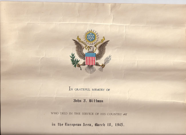 Dear Phil: The facts as I KNOW them, as I DO remember him somewhat from my childhood, and of course my mother spoke of him often are: John went to Sacred Heart School, married a woman named Ann Wass, and had two children…John Joseph and Roseanne. His parents were Joseph J. and Katherine Bittmann who resided at 1815 Tioga Street, Camden, NJ. When John married, he also bought a home on Tioga Street a few doors up from his parents. At the time he was drafted, he was a driller/reamer working in the NY Ship Yard in Camden, NJ. I was always told he was drafted, had 6 to 8 weeks of training and was sent home on leave in December 1944 and then shipped overseas on the Queen Mary to France where his unit was in the Battle of the Bulge. John stepped on a land mine that blew his legs off. He died of loss of blood and shock. His buddy came back and told the family what happened to him. I believe his last name was Grello…maybe Mike Grello? He is buried in New St. Mary's Cemetery with his parents and the tombstone lists his date of death as March 18, 1945. I remember the news came of his death, the same day my grandfather was being laid out. He died on March 25, 1945. I remember it was a terrible time for the family. My mom used to write to John when he was in the service. I remember she had saved all his letters home. Unfortunately, they are not to be found now, so I don't know unit he belonged to. They would have also had his serial # on them. I remember seeing them as a child written on the airmail paper they used back then. I am attaching a photo of John, taken while he was home on leave in Dec. 1944 in front of his mom's house. Respectfully, Mary