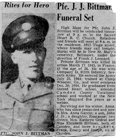 PRIVATE FIRST CLASS JOHN J. BITTMAN was born John J. Bittmann in January of 1919 to Joseph and Katherine "Katie" Bittmann. The Bittmann family lived at 1815 Tioga Street in Camden, where Joseph Bittmann worked as a pipe fitter at the McAndrews & Forbes licorice factory at South 3rd & Jefferson Streets in Camden. Joseph and Katie Bittmann were both German-speaking immigrants from what had been Austria-Hungary, who had come to America in 1906. John Bittmann was the fifth of six children, coming after Catherine, Francis J., Henry G., and Elizabeth, and before Joseph. He was raised in Camden, was a member of the Church of the Sacred Heart at Broadway and Ferry Avenue. He attended school at the Sacred Heart Catholic School and the Camden County Vocational and Technical School in Pennsauken NJ. As an adult John Bittmand dropped the last "n" off of his name and went as John Bittman. He worked as welder and as a driller-reamer at the New York Shipbuilding Company, Before entering the service, he had married Anna Wass, and had moved into a nearby home at 1805Tioga Street. The couple had two children, John Joseph and Roseanne, before John Bittman was called to service in July 1944. After John Bittmann was drafted, his wife worked as a welder at his old job at New York Ship. Private John Bittman was sent overseas in January 1945 as an infantry replacement. Assigned to Company D, 411th Infantry Division, 103rd Infantry Regiment, he saw action in the Alsace region of France. The 103rd Infantry Division had occupied defensive positions west of Sarreguemines, France during the Battle of the Bulge. The Division crossed into Germany, to the city of Reichshofen, on January 14, 1945, where it took up positions along the Sauer River. Defensive patrols were active and a limited attack on Soufflenheim on the 19th was repulsed by the enemy. On the 20th, the division withdrew to the Moder River and repulsed German advances near Muehlhausen, 23�25 January. The 103d's offensive began on March 15, 1945. Crossing the Moder and Zintzel Rivers and taking Muehlhausen against sharp opposition, the division moved over the Lauter River and penetrated the defenses of the Siegfried Line. Private First Class Bittman was killed in action in during this operation, on March 18, 1945 after stepping on a land mine. Private John Bittman was survived by his wife and children, his parents, three brothers, and two sisters. His father passed away on March 25, 1945, his mother joined them both the following year.. John Bittman was brought home after the war, and was buried at New St. Mary's Cemetery in Bellmawr NJ alongside of his parents. |