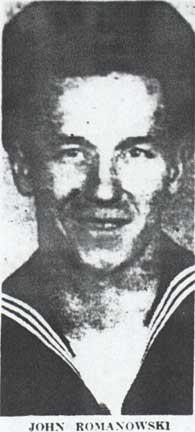 SEAMAN SECOND CLASS JOHN ROMANOWSKI was born on March 2, 1917. He died aboard ship due to reasons not related to combat on September 16, 1944. He had lived with his wife Elizabeth and sons John, Edward, Robert, and William at 279 Liberty Street in Camden NJ. On November 19, 1943 he passed his physical at the draft board, and he entered the Navy on December 10, 1943. John Romanowski was survived by his wife and children, his mother, Sophie Lewandowski of 35 Swarthmore Avenue, Gloucester Heights NJ, and sisters Mrs. Sophie Safryn of Camden and Mrs. Anna Gnojski of Gloucester Heights NJ. A Requiem Mass was held for him at the Resurrection of Christ Church, Mount Ephraim Avenue and Thurman Street, Camden NJ. His death was reported in the September 23, 1944 edition of the Camden Courier-Post. |
