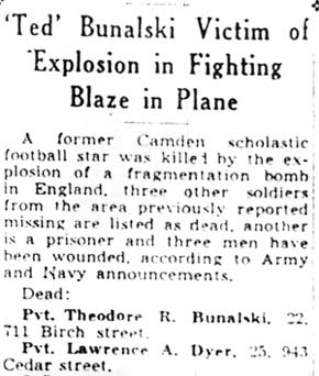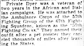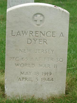 PRIVATE FIRST CLASS LAWRENCE ALTON DYER was born May 18, 1919 in Greensboro MD. He spent most of his life in Camden, attending the Sewell School and the Camden County Vocational Training School. He enlisted in the Army on February 16, 1941 and went overseas in June 1942 as a member of the medical detachment of the 65th Fighter Squadron, 57th Fighter Group. This unit had been delivered by ship to Ghana in West Africa to the Middle East to aid The British 8th Army in their fight against Italian and German forces under Field Marshal Erwin Rommel. P rivate Dyer and his unit were first based in what was then Palestine, then in Egypt as combined Anglo-American forces under General Montgomery chased the enemy 1400 miles across the Libyan desert and out of Africa. After reaching Algiers Dyer participated in the invasion of Sicily and Italy, and his unit was based on the island of Corsica when he met his end. Lawrence Alton Dyer was survived by his mother, Mrs. Eva Dyer, of 943 Cedar Street in Camden NJ. He also was survived by a brother James, who is in the Army and was stationed at Newport AR as a baker, and a sister Mrs. Norman Tantum of Hamilton Square NJ. After the war, his body was returned to the United States, and he was buried at Beverly National Cemetery in Beverly NJ on November 24, 1948. |