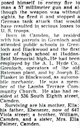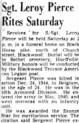 STAFF SERGEANT LEROY PIERCE, 24, of 536 South 8th Street, Camden NJ was killed in Belgium. His parents, Mr. and Mrs. Ebenezer "Ebbie" Pierce were notified he was killed in action on December 24, 1944. They were also informed that he has been recommended for the Bronze Star award for meritorious service.The citation for the honor said Pierce exposed himself to enemy fire to man a 57 millimeter gun, and although the weapon was without sights, he aimed it through the bore and stopped a German tank attack that would have resulted in serious losses to U.S. troops.Born in Camden NJ, he grew up and went to school in the Grenloch and Blackwood neighborhoods of Gloucester Township NJ. He attended one year of high school at Haddonfield Memorial High School in Haddonfield NJ. He worked for the A.L. Hyde Co. he A.L. Hyde Co., in Grenloch and as an auto mechanic for Joseph E. Plasket in Blackwood. He had moved to 536 South 8th Street in Camden prior to his induction into the United States Army in May of 1940. He went overseas with the 10th Armored Infantry Battalion of the 4th Armored Division.Leroy Pierce was brought home in the spring of 1949. He was buried at Bethel Cemetery in Hurfville NJ on May 7, 1949. He is also memorialized on the World War II War memorial in Blackwood NJ, and the Gloucester Township War Memorial. Leroy Pierce was survived by his parents, of 408 Webster Street in Camden, a brother William Pierce, of Camden, and a sister, Mrs. Ella Palmer, also of Camden. |