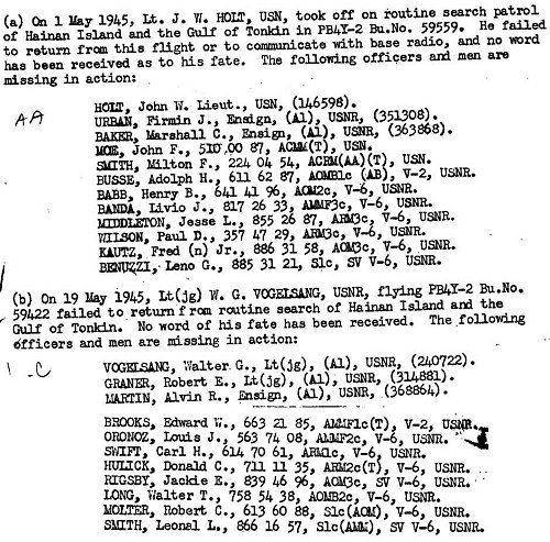 AVIATION MACHINISTS MATE LIVIO JOSEPH BANDA was born July 24, 1924 in Camden NJ, the son of Biagio and Aldovina Banda. Mr. and Mrs. Banda had immigrated from Italy. In 1920 they were living with their son Vincent at 125 Birch Street, in Camden NJ. The family later moved to 320 Birch Street. According to Census records, Biagio Banda worked as a laborer in one of Camden's many factories. After entering the United States Navy, Livio Joseph Banda trained as an aerial gunner. He served as the bow turret gunner on a Consolidated PBY4-2 Privateer patrol bomber, as a member of squadron VPB-119. The Privateer was the naval version of the Army Air Force's well known B-24 Liberator bomber, modified for naval use by the addition of addition electronics, crew space, and armament. The Privateer entered Navy service during the late summer of 1944. VPB-118 and VPB-119 were the first Fleet squadrons to equip with the Privateer. Livio Banda's squadron was established on August 15, 1944 as Patrol Bombing Squadron VB-119. On October 1st, 1944 forward, all units flying the PBY4-1 Liberator and PBY4-2 Privateer were re-designated as "VPB" squadrons, i.e., Patrol Bombing Squadrons. The unit's initial training station was at NAAS Camp Kearny, California until December 15, 1944. They were then deployed to Kaneohe naval station, Hawaii for further training. From January 3 thru 14, 1945, the unit was deployed to Midway Island and performed 'Offensive Search' operations. They then returned to Kaneohe for further training. The first overseas deployment of the Privateer patrol bombers began on January 6, 1945, when VPB-118 left for operations in the Mariana Islands. VPB-119 deployed a few weeks later after completing training and outfitting at Kaneohe. Leaving Hawaii on February 7, 1945, the fifteen planes of VPB-119 arrived at Tacloban in the Philippine Islands on February 11, 1945. On February 13 the squadron reported to Mokerang in the Admiralty Islands for further training and maintenance, then returned to the Phillipines. On March 1, 1945 VPB-119 began Offensive Search operations, flying out of Clark Field in the Philppines. Livio Banda was assigned to Crew 4, under the command of Lieutenant J.W. Holt. Lieutenant Holt had served as the pilot for Ambassador Stanley, the nation's chief emissary to the Soviet Union. On the first day of operations from Clark Field, Lieutenant Holt's crew encountered a small Japanese northeast of Okinawa with three destroyer escorts and three cargo vessels. Lieutenant Holt took the plane down through anti-aircraft fire to masthead level, and, with Aviation Machinist's Mate Banda manning the guns in the bow turret, proceeded to strafe the convoy. The gunfire was effective, setting off an explosion that sank one freighter. A fire was started aboard one of the destroyer escorts, and another freighter was set ablaze. Only a lack of ammunition prevented the total destruction of the Japanese convoy. Flying with Crew 4, Livio Banda was killed in action when his plane was shot down on May 1, 1945 over Hainan Island, in the Gulf of Tnkin, off the southern coast of China. The plane and crew were listed as missing at the end of the war, however the wreckage and remains were eventually found and were returned to the States in 1949 for burial. Relatives of another crew member (A.H. Busse) advise that the plane wreckage was found on "a hill called Pen Lu Po Ling about a mile opposite the village of Ling Tow in Kuong An Huing, Ling Shui, Hainan Island". The date of the identification was not specified. Livio J. Banda and fellow crew members, Leno G. Benuzzi and Fred Kautz were buried at the Jefferson City National Cemetery, Jefferson City MO on August 5, 1949. As identification of the three men was difficult due to the circumstances of the crash and condition of the crash site, they were interred together in Plot 2 0 14-15. |