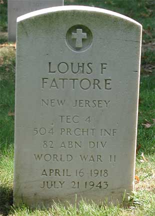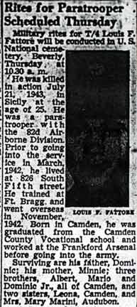TECHNICIAN FOURTH CLASS LOUIS F. FATTORE was born in New Jersey on April 16, 1918 to Domenic and Domenica Fattore, who had come to America from Italy, in 1903 and 1913 respectively. Domenic Fattore worked as a cement finisher. Louis, named Luigi at birth, was their first child. He was followed by Mario, Domenic Jr., Mary, and Leona. There was also a step-son, Alberto J. Fattore. The family was living in 1930 at 826 South 5th Street in Camden NJ. Louis Fattore attended Woodrow Wilson High School on Federal Street in East Camden, before transferring to Camden County Vocational School on Browning Road in Pennsauken NJ, where he graduated in 1939, after studying electricity and radio. Louis Fattore had enlisted into the Army in March of 1942 and reported to Fort Dix NJ. By October of 1942 he had been promoted to Sergeant, and was stationed at Fort Bragg NC. He volunteered for parachute duty, and was trained at Fort Benning GA. On 1 May 1942 The 504th Parachute Infantry Regiment (PIR) was activated at Fort Benning, Georgia and was later attached to the newly designated 82nd airborne division under General Omar N. Bradley . In April 1943, the 82nd departed Fort Bragg and eventually arrived at Casablanca, Morocco, on May 10. Shortly, the Division moved to Oujda where intense training was conducted for the invasion of Sicily—Operation HUSKY. After arriving in Casablanca, the 504th began the grueling preparations for the drops into Sicily from their base in North Africa. On July 9, 1943, the 505th Parachute Infantry conducted the first American regimental combat parachute assault in the vicinity of Gela, Sicily. The paratroopers were widely scattered, but were able to gather into small groups to harass the enemy. On the night of July 10, the 504th was ordered to jump on the Farello Airstrip, which was held by the Americans. On the evening of July 11, the remainder of the 504th parachuted into Sicily. Passing over the American fleet, the transports were mistaken for enemy bombers. One anti-aircraft gunner opened up on the transports and soon other itchy trigger fingers jerked in response. Twenty-three of 144 USAAF transports were shot down by friendly fire. Eighty-one troopers were killed, including the assistant division commander, Brigadier General Charles Keerans. The 82nd continued its fighting in Sicily by leading Patton�s westward drive to Trapani and Castellemare. In five days, the Division moved 150 miles and took 23,000 prisoners. Fighting continued on Sicily, and Louis Fattore was killed in action on July 21, 1943. His death was reported in the August 27, 1943 edition of the Camden Courier-Post. When the war was over, his body was returned to America, and he was buried at Beverly National Cemetery in Beverly NJ on July 29, 1948. Brother Mario Fattore Joined the Camden Fire Department in 1948, and a nephew, Louis Fattore also went on to serve as a Camden fire fighter. |