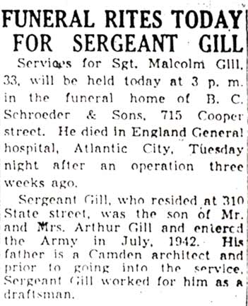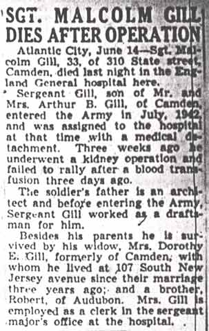 After graduating high school, Malcolm Gill worked as a draftsman in his father's business in Camden. He married Mae Edginton, and the couple lived at 210 State Street, Camden NJ. He was inducted into the Army in July of 1943, and served in a medical detachment in Atlantic City NJ. Malcolm Gill died June 13, 1944 of complications from a kidney operation he had under went three weeks previously. A blood transfusion had been attempted on the 12th, but he failed to rally. He was survived by his parents, brother Robert, and his wife, Mrs. Mae Edginton Gill. |
